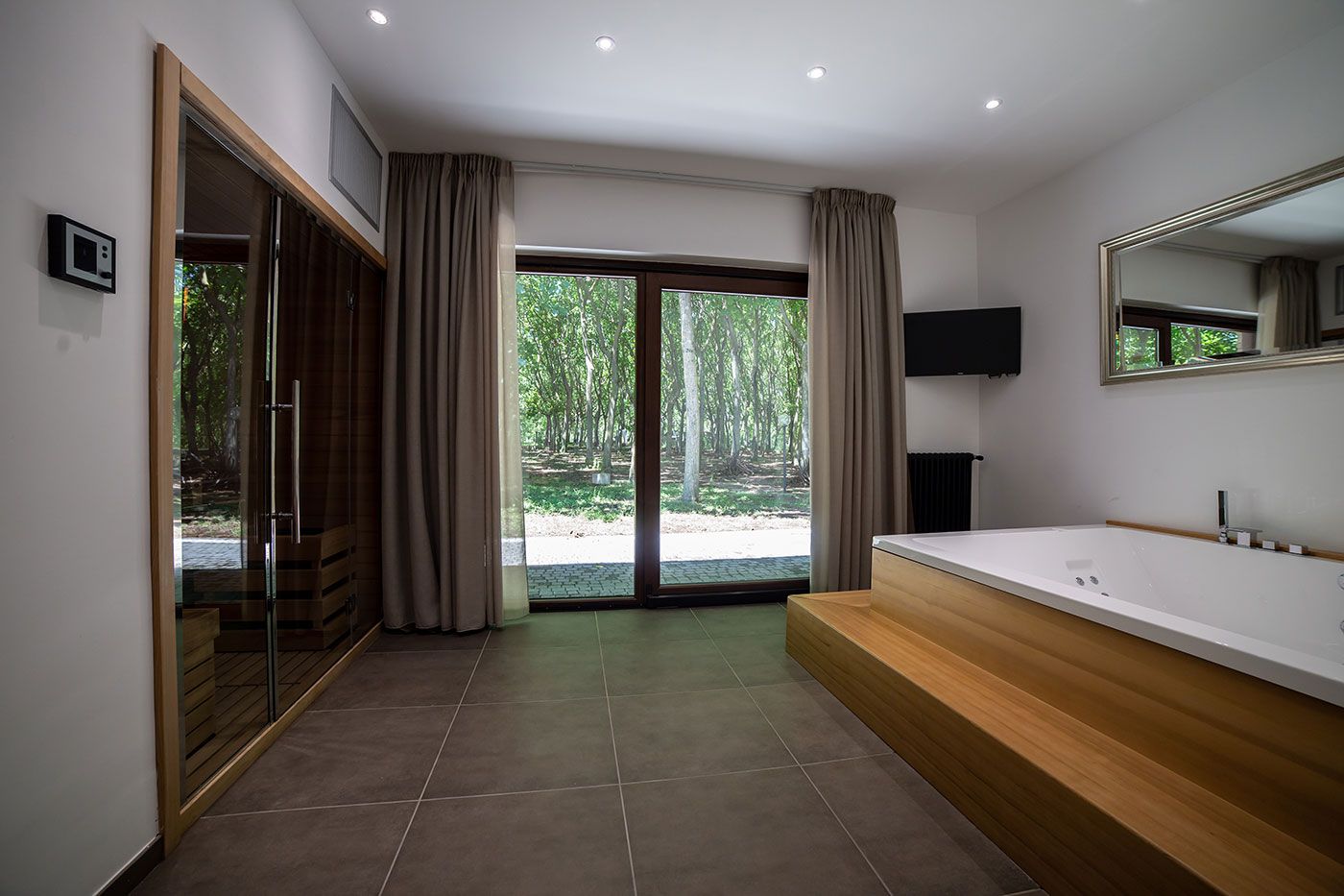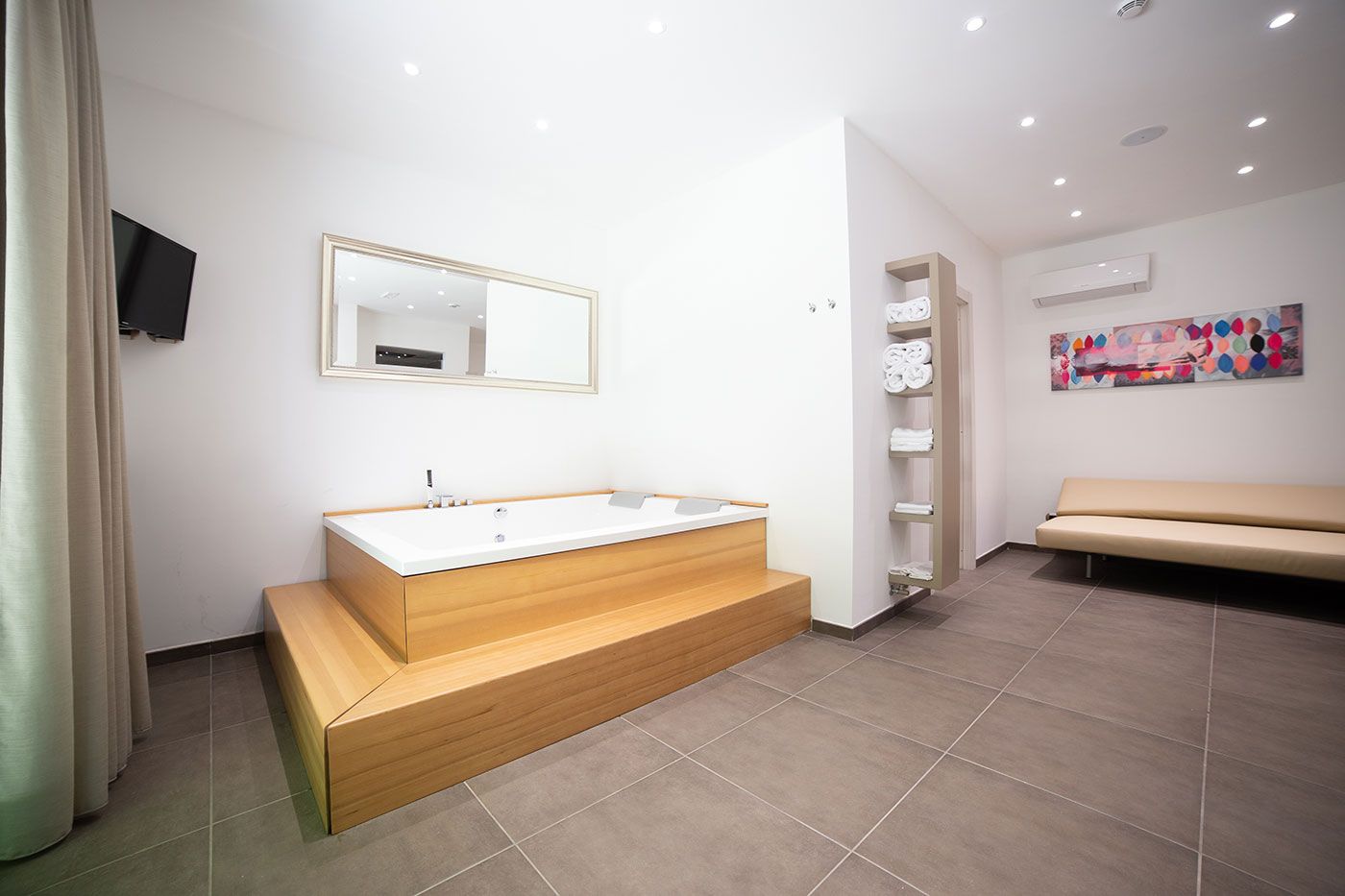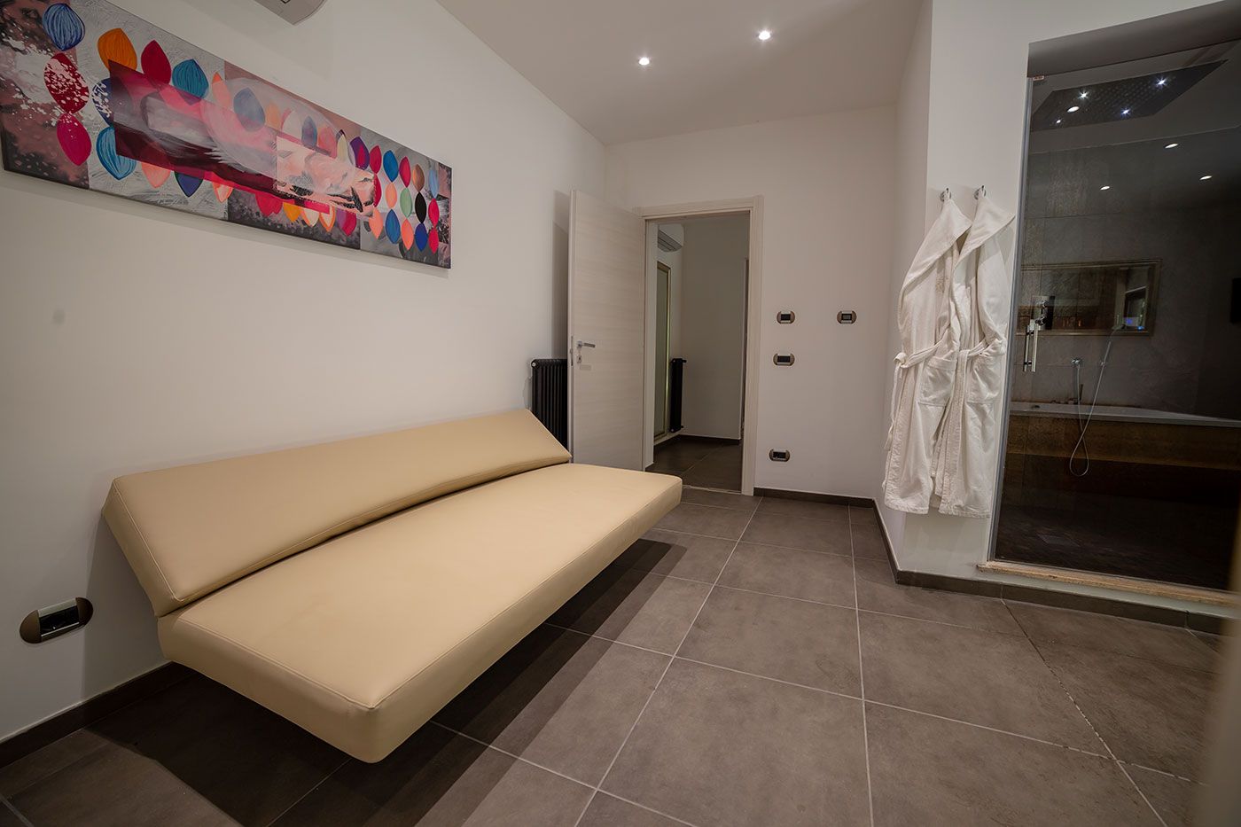 Dotata di ogni comfort, la nostra Suite è disponibile per tutti coloro che vogliono vivere momenti indimenticabili trascorrendo un soggiorno all'insegna dell'eleganza e della comodità. La suite è dotata di iacuzzi, sauna, doccia emozionale, un comodo divano e una ricca dotazione di cortesia.